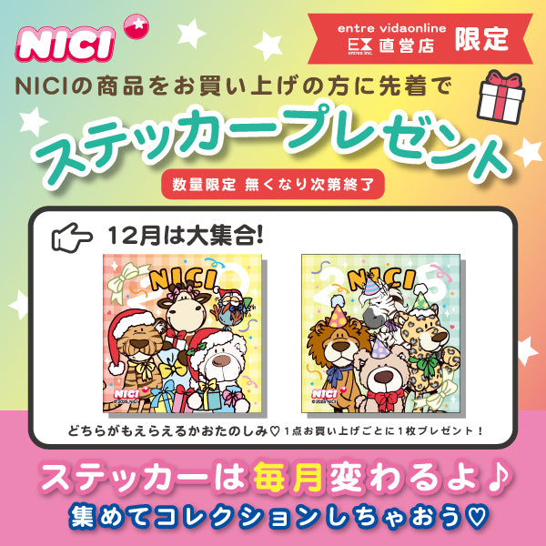 【プレゼント内容】2025年12月1日(月)ご注文分から対象、NICI商品お買上の方にentre vida限定ステッカーをプレゼント!!どちらが届くかはお楽しみ♪無くなり次第終了となりますのでお早めに!