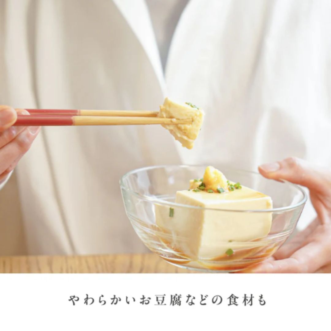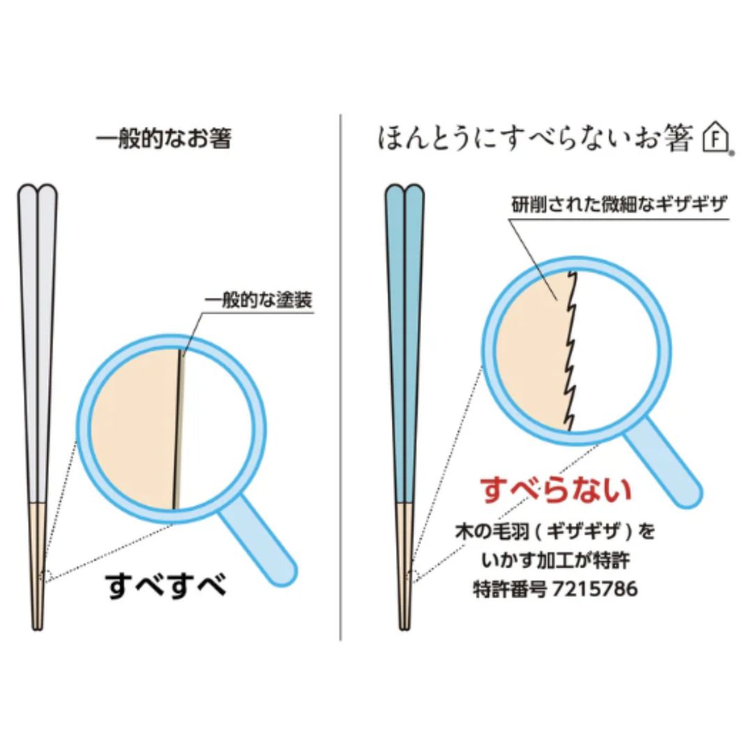 スタッドレス加工によって、ツルっとした麺類やこんにゃくも簡単につかめる「ほんとうにすべらないお箸」
