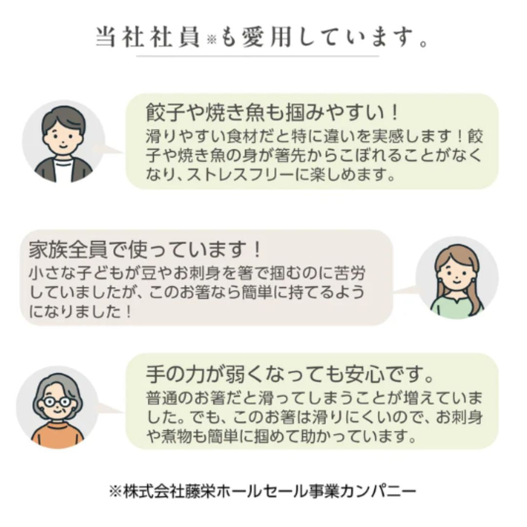 また、お子さまのお箸トレーニングから普通のお箸へ移行するときや、ご年配の方も力を入れなくて使えるのでギフトにもおすすめです。